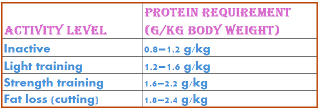 Example: A person weighing 70 kg doing regular strength training would need around 112–154g of protein daily.