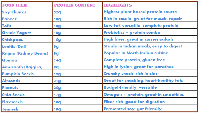 Here’s a power-packed list of protein-rich vegetarian foods that are popular in Indian diets (Per 100g)